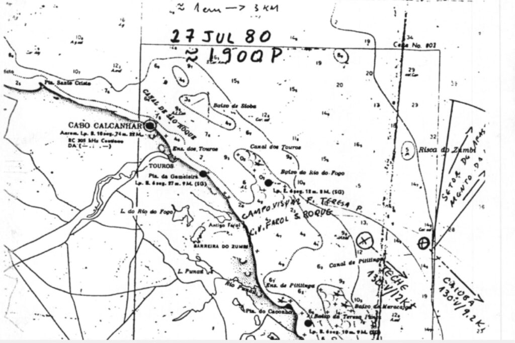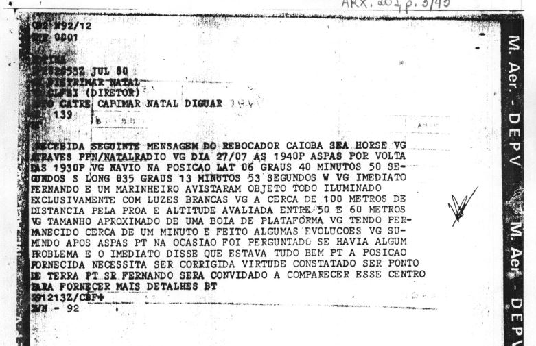 Este post se embasou no relatório oficial da investigação, publicado em novembro de 1980, conduzido pelo Centro de Lançamento de Foguetes Barreira do Inferno, (CLFBI – atual CLBI), que teve como objetivo “compilar informes e se possível estabelecer correlação que possam, eventualmente, esclarecer os fatos relacionados como o assunto mencionando no TLX R-282053Z JUL 80, do III Distrito Naval ao CLFBI”.