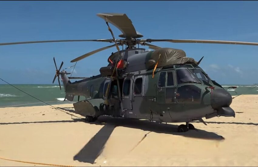 Um helicóptero H-36 “Caracal” da Força Aérea Brasileira (FAB) realizou um pouso de emergência, no sábado (18), na praia de