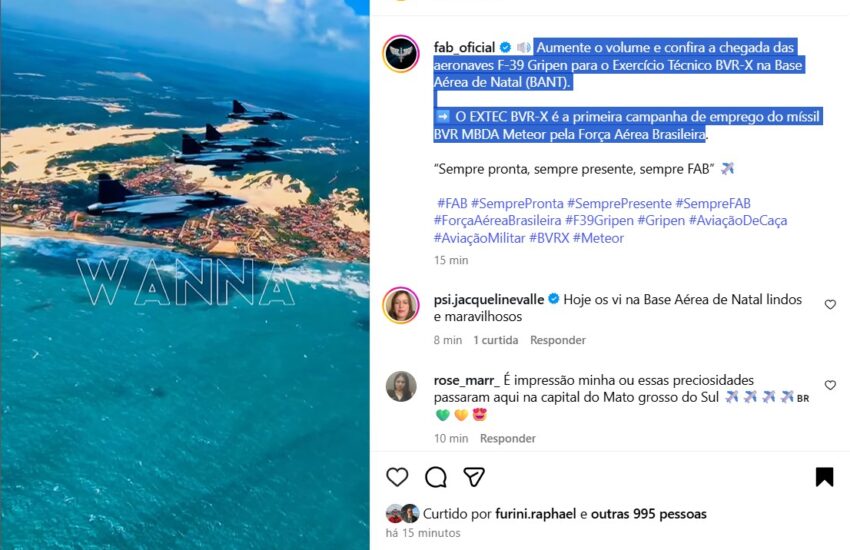 A Força Aérea Brasileira (FAB) tirou do ar a postagem de sua conta oficial no Instagram que divulgava o Exercício