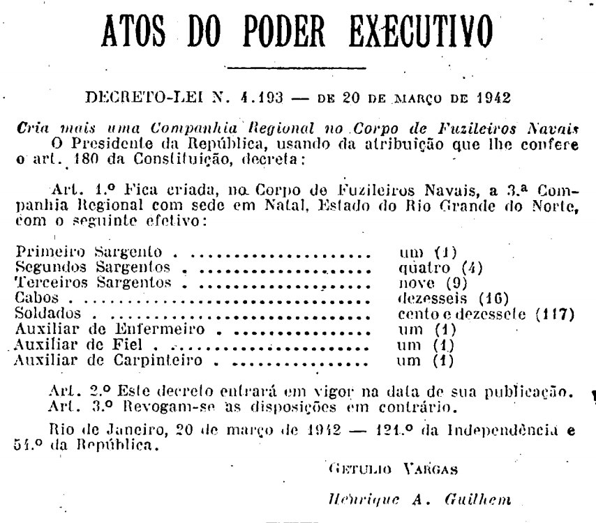 Art. 1º Fica criada, no Corpo de Fuzileiros Navais, a 3ª Companhia Regional com sede em Natal, Estado do Rio Grande do Norte, com o seguinte efetivo: