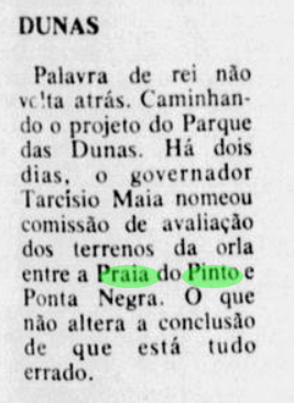 Na década de 1970, quando o Governo do Estado inicia discussões em torno da regulamentação da Via Costeira e do Parque das Dunas e em ambos o projeto, considera a localidade como praia do Pinto. O nome Miami se torna mais difundido a partir de 1976, quando se tenta atrair empreendimentos hoteleiros para Natal e investidores da indústria do turismo.